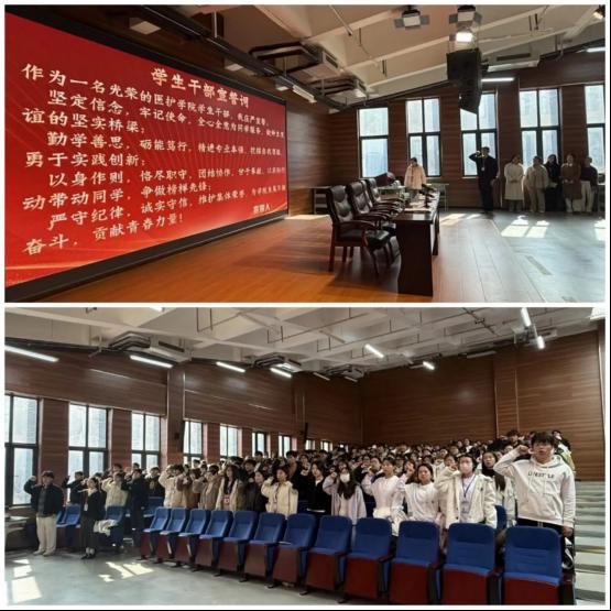 仪式在庄严的国歌声中拉开帷幕。周凤雷首先致辞,强调学生干部要坚定理想信念,锤炼过硬本领,珍惜培训机会,勇于担当作为,切实发挥模范带头作用,努力成长为德才兼备的时代新人。接着,马忠友详细介绍了培训方案,并就培训期间的各项安排和注意事项作具体说明。学生代表24级护理1班洪思豫的发言,分享了将专业素养融入学生工作、在服务集体中践行初心使命的体会。随后,全体学员在领誓人24级护理5班汪坷均的带领下庄严宣誓,展现了医护学子听党话、跟党走,奋发有为的精神风貌。