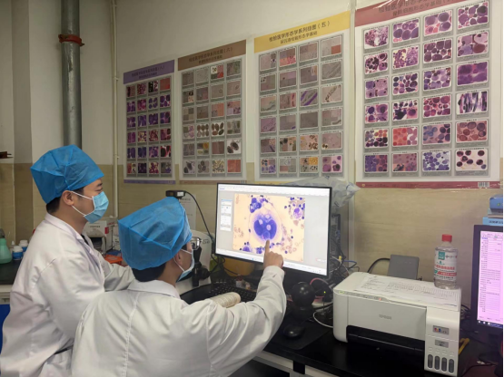 黄河医院检验科带教医生刘权(左)正在耐心指导实习学生马明想(右)进行影像分析