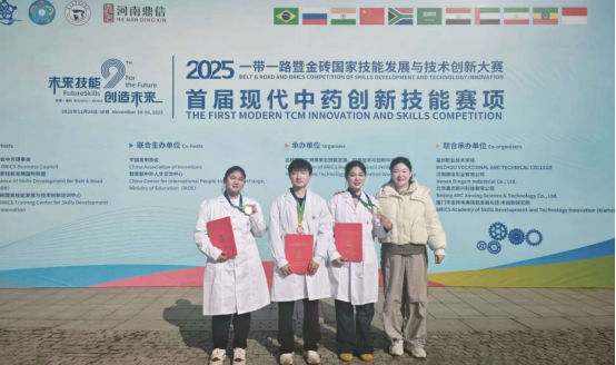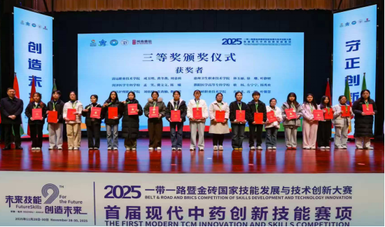 2025年11月30日,一带一路暨金砖国家技能发展与技术创新大赛首届现代中药创新技能赛项全国总决赛在安徽亳州圆满落幕。医护学院中药学专业直光北、高一明、叶馨慧三位同学组成的参赛队伍,在指导教师李晔、倪志龙的全程护航下,凭借扎实的专业积淀、亮眼的创新思维与稳健的临场表现,从全国众多优秀团队中突围,斩获全国总决赛铜奖,为学院赢得殊荣!