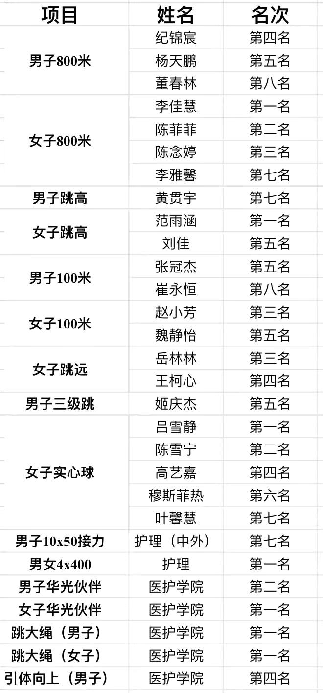 赛场上,医护健儿驰骋各类项目,奋勇拼搏、尽显锋芒。百米赛道上,他们如离弦之箭全力冲刺,绽放青春速度;800米长跑赛道,运动员们克服体力消耗,坚持不懈、奋力向前,用毅力突破自我;跳远、三级跳远赛场,助跑、踏跳、落地一气呵成,身姿轻盈舒展,全力追逐更远距离;背抛实心球项目中,选手们蓄力抛投,用力量与技巧展现青春力量;跳高赛场,大家助跑起跳、轻盈过杆,不断挑战新高度、超越自我;引体向上项目里,选手们奋力拼搏,尽显力量与耐力;4×400米接力、10×50米迎面接力、跳大绳、华光伙伴团体项目中,学子们团结协作、默契配合,小小接力棒传递信任与荣誉,集体项目凝聚向心力与团队魂,尽显同窗情谊与集体担当。